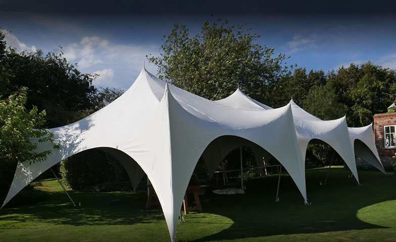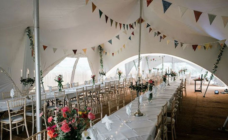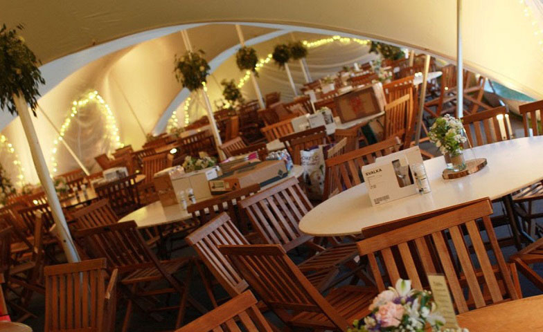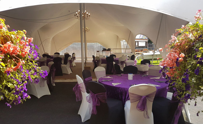 fully dressed marquee with tables & chairs table linen and chair covers / lighting / bar area